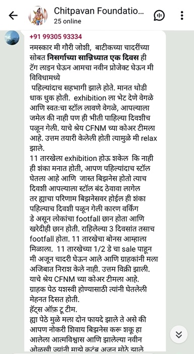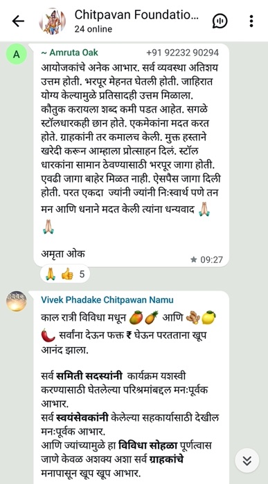 तसेच सर्व आवश्यक त्या सुविधा योग्य वेळेत आणि विना सायास उपलब्ध करून दिल्याबद्दल सर्व स्टॉल धारकांनी चित्पावन फौंडेशन, नवी मुंबई चे मनापासून आभार मानले. तसेच भविष्यात अशी संधी उपलब्ध करून दिल्यास अवश्य लाभ घेऊ असे आग्रहाने आश्वासनही दिले.
