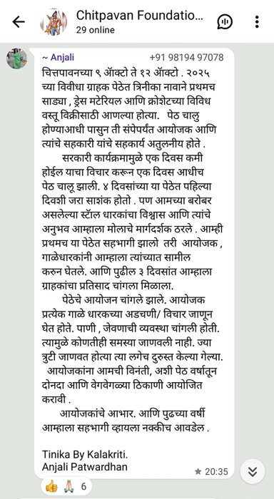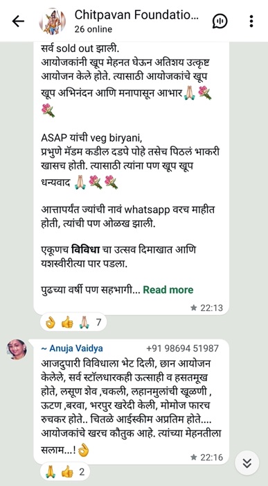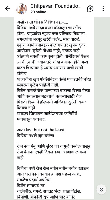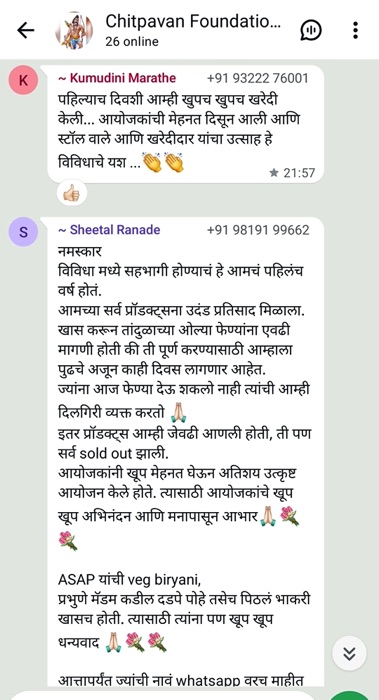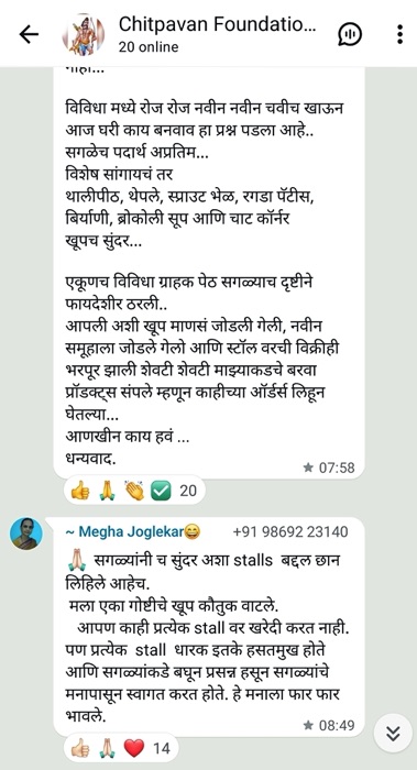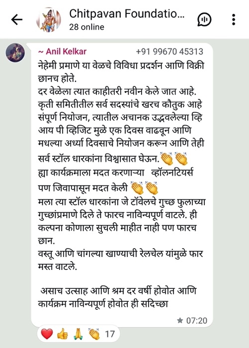 तसेच सर्व आवश्यक त्या सुविधा योग्य वेळेत आणि विना सायास उपलब्ध करून दिल्याबद्दल सर्व स्टॉल धारकांनी चित्पावन फौंडेशन, नवी मुंबई चे मनापासून आभार मानले. तसेच भविष्यात अशी संधी उपलब्ध करून दिल्यास अवश्य लाभ घेऊ असे आग्रहाने आश्वासनही दिले.